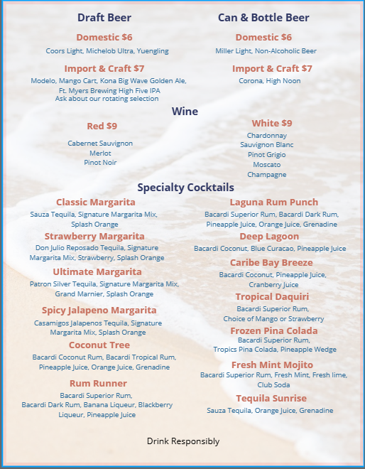 Our tiki bar isn’t just about drinks – it’s a full experience that combines Caribbean-inspired cocktails with delicious bites. Whether you’re looking for a light snack or a full meal, our Tiki Bar has you covered.